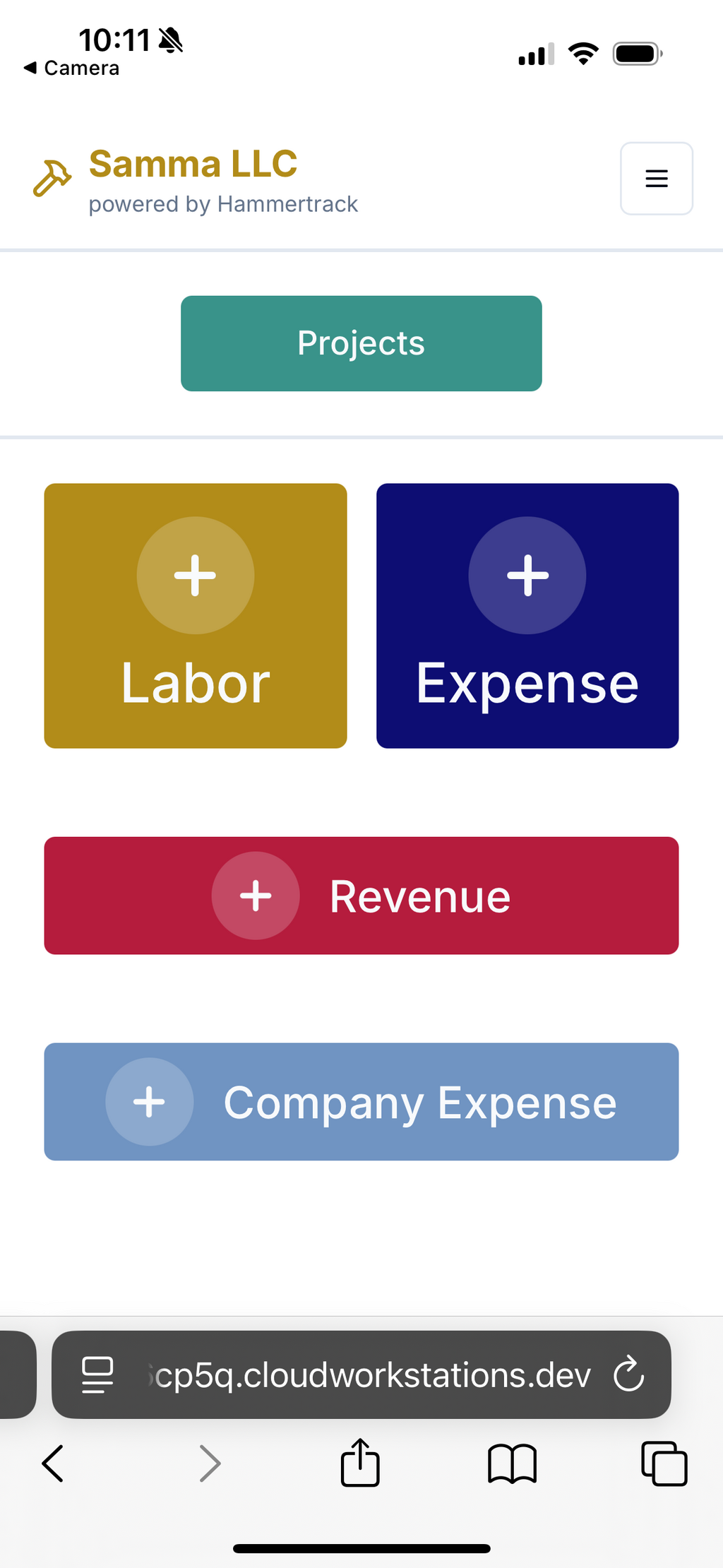 The dashboard is the home screen, but more importantly, it is also the action screen... 90-95% of your Hammertrack activity will be adding pieces of information, so the buttons to Add Labor or Add Expense (the most frequently used buttons, by far) are front and center as soon as you open the app.