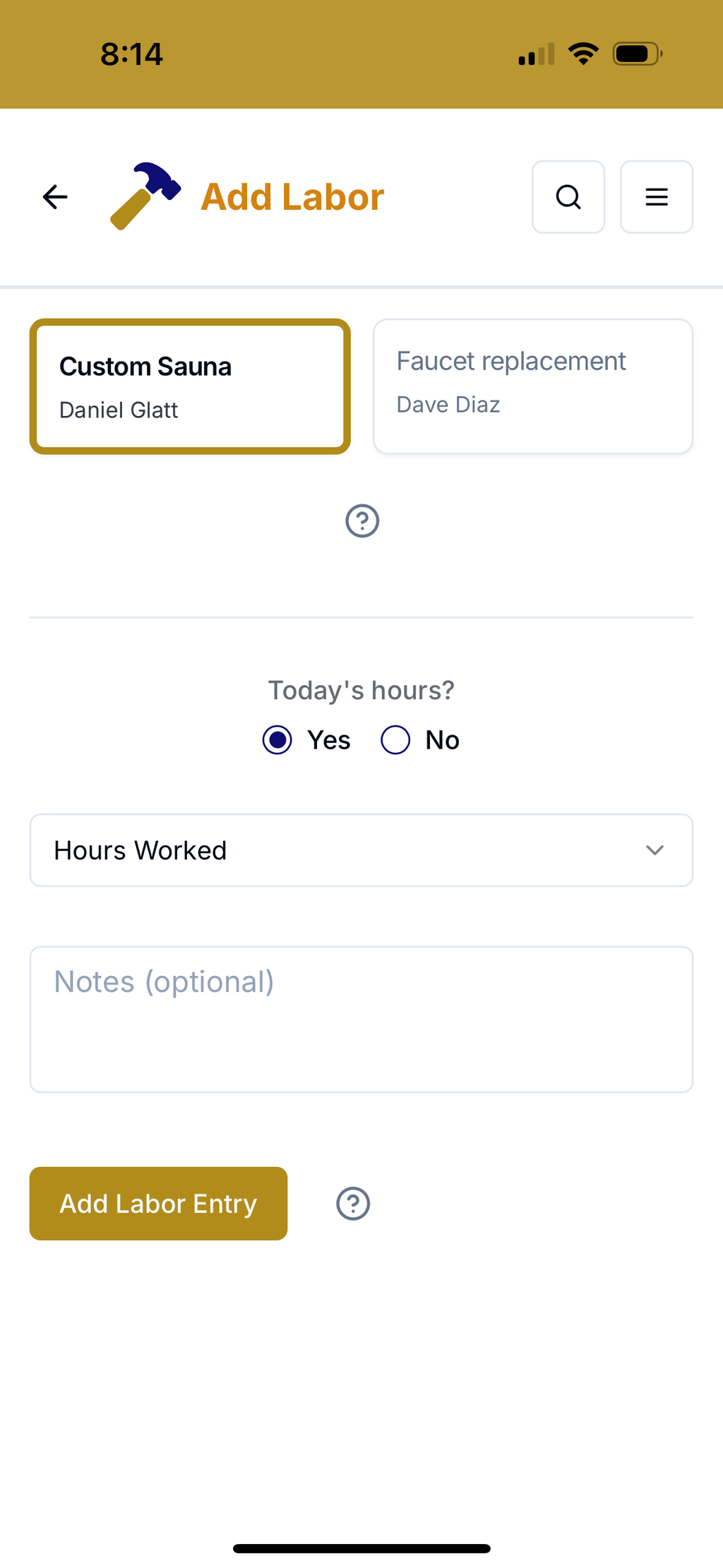 When you tap on the Add Labor button, you'll see a very simple screen designed for speed... at the top is the Project field--the Project with the most recent activity in the app will appear first and be pre-selected, but all projects with an "Active" status will be listed and selectable.