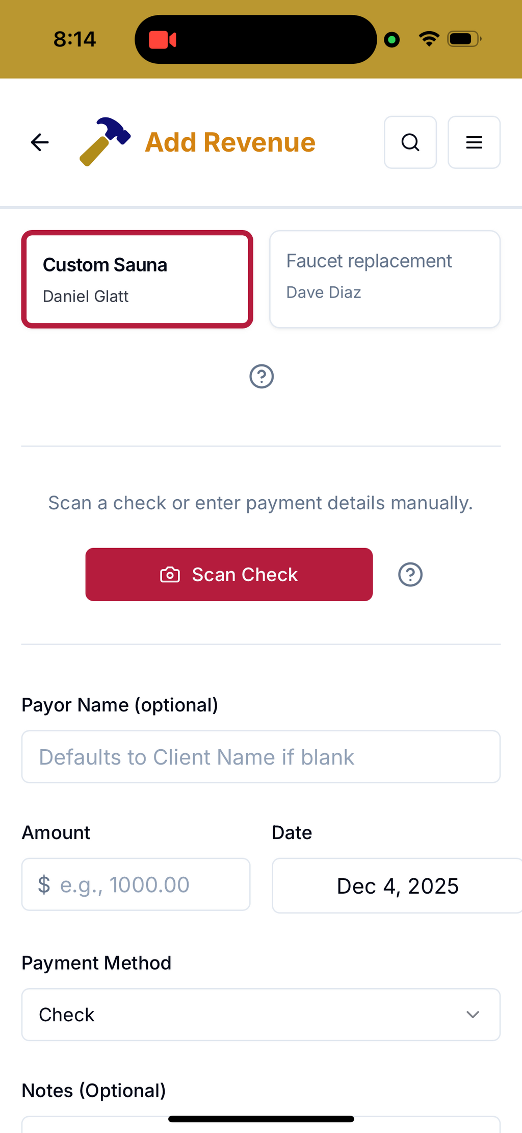 The Add Revenue workflow is very similar to the Add Expense workflow... choose the Project and tap Scan Check to take a photo of it and have the app extract the data, or add the details manually. Once again, the image will be saved for record-keeping and future review, so you can ditch the paper (after you deposit the check, of course).