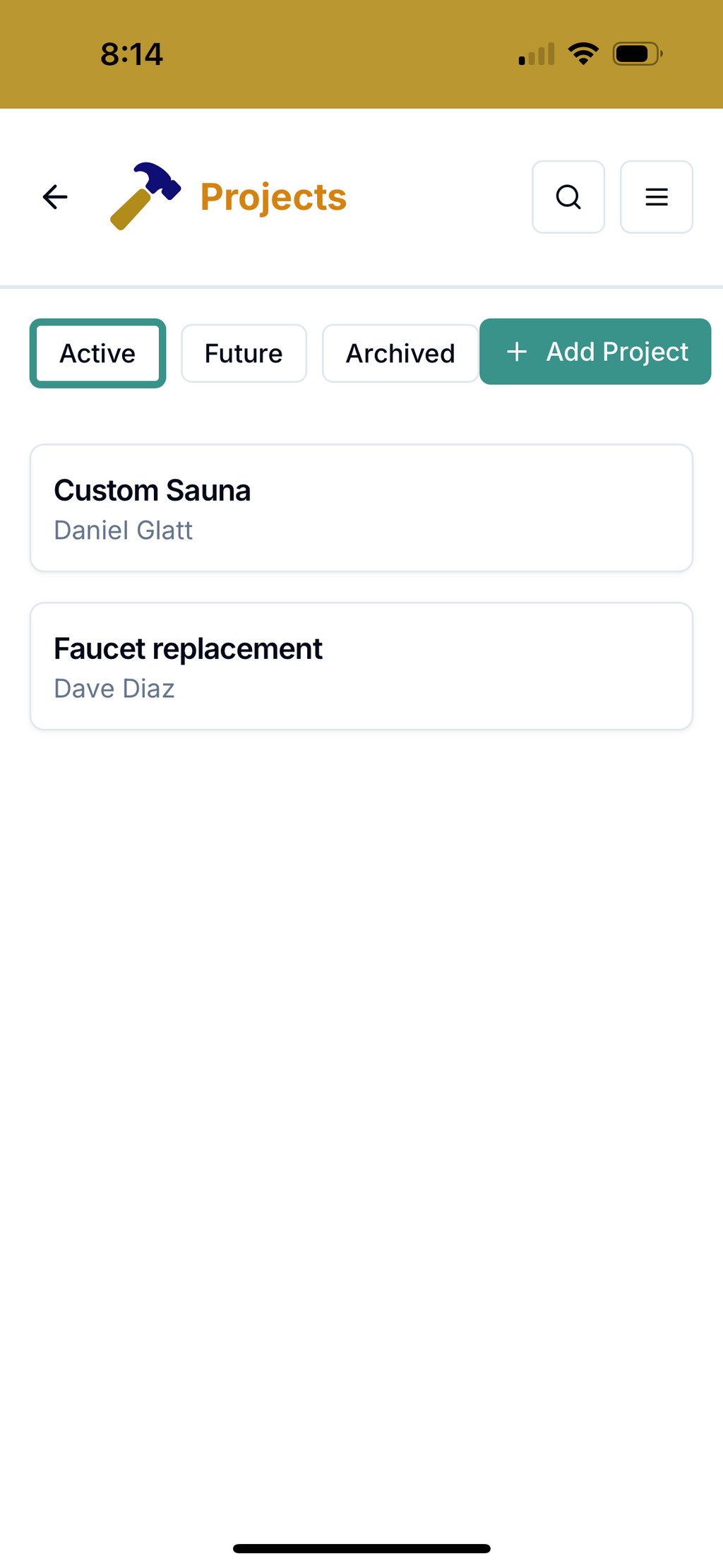 Not surprisingly, Projects are how your work and transactions are organized in Hammertrack. You'll need to add at least one Project before you can Add Labor or Add Expense. Tap the Projects button to see a list of existing Projects or to add a new Project.