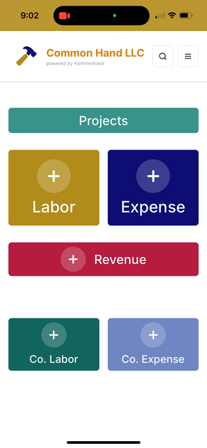 The dashboard is the home screen, but more importantly, it is also the action screen... 90-95% of your Hammertrack activity will be adding pieces of information, so the buttons to Add Labor or Add Expense to a Project (the most frequently used buttons, by far) are front and center as soon as you open the app.