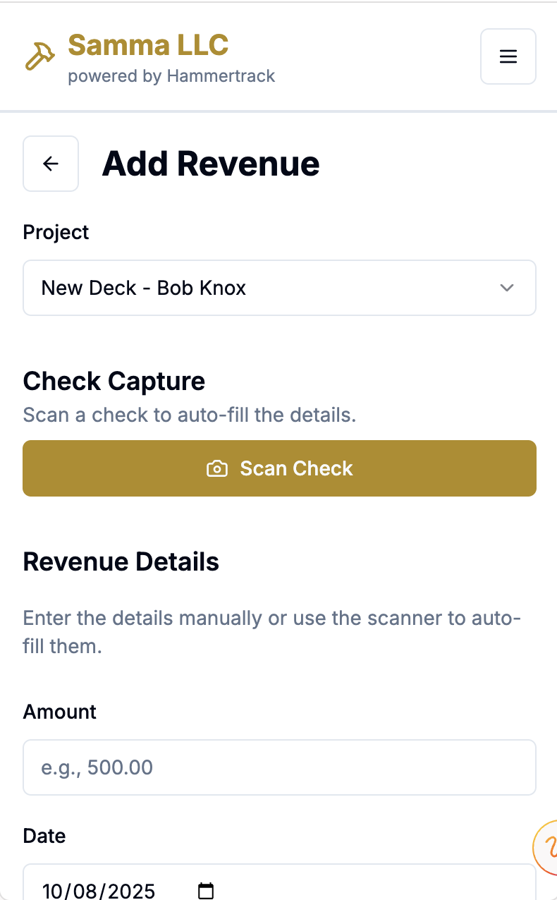 The Add Revenue workflow is very similar to the Add Expense workflow... choose the Project and tap Scan Check to take a photo of it and have the app extract the data, or add the details manually. Once again, the image will be saved for record-keeping and future review, so you can ditch the paper!