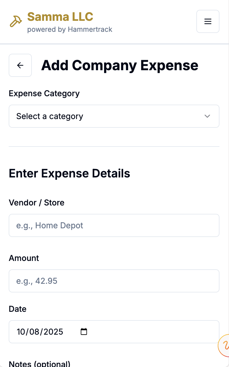 Adding a Company Expense works the same way as adding an expense to a Project, but it's for any expense that isn't associated with a Project. In place of the dropdown field to select a Project, there's a dropdown field to select the Category that the receipt belongs to (Tools, Vehicles, Insurance, etc.)
