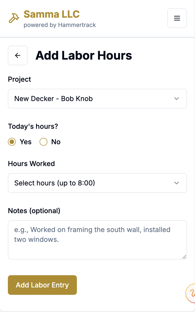 When you tap on the Add Labor button, you'll see a very simple screen designed for speed... at the top is the Project field--the Project with the most recent activity in the app will appear first, but all projects with an "Active" status will be listed in this dropdown. Choose the correct Project for the hours that you are about to add.