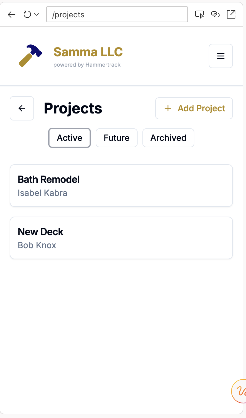 Projects are how most of your work (and therefore your data in Hammertrack) is organized. Tapping the Projects button brings you to the Projects screen where you can view existing Projects or add a new Project.