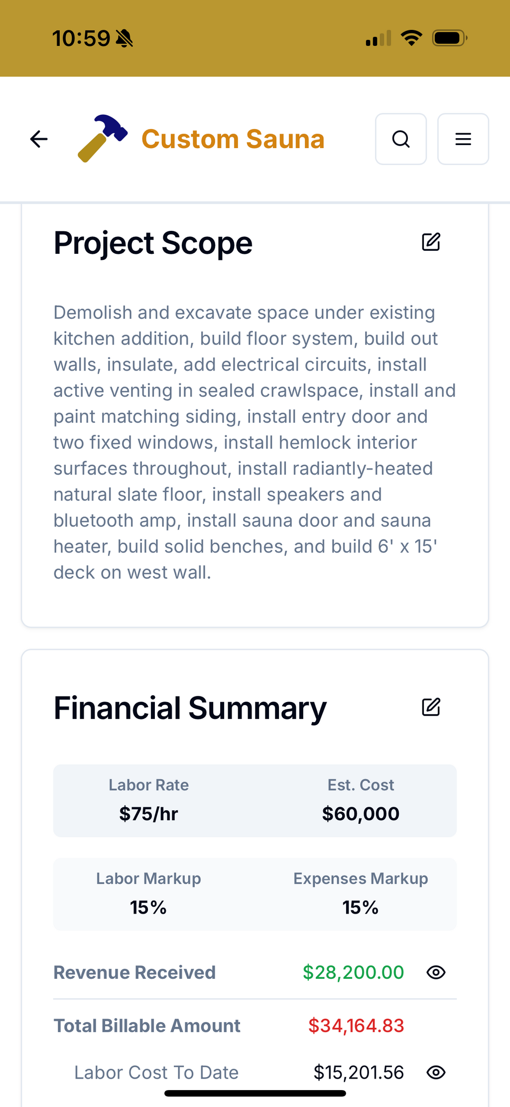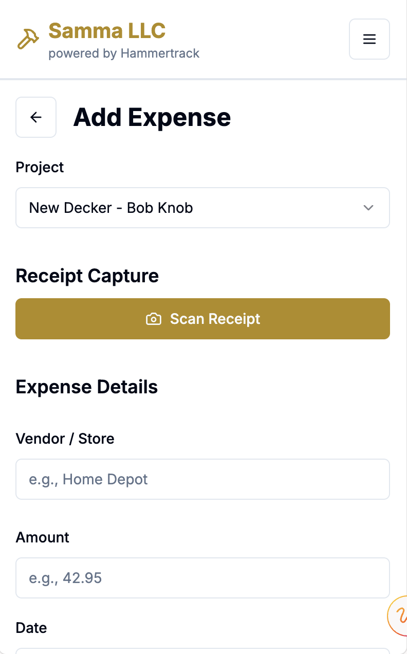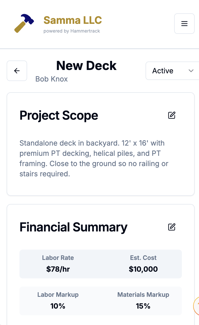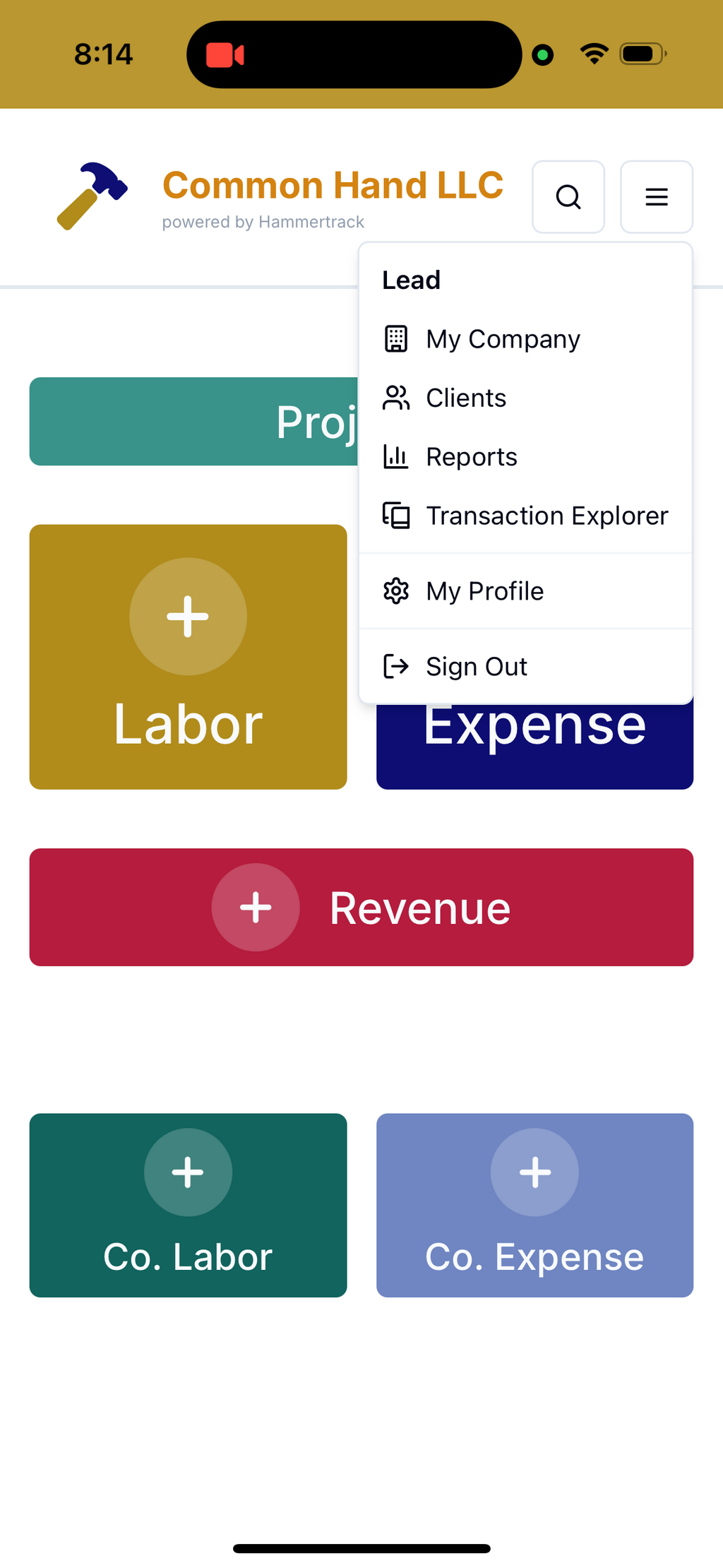 Not surprisingly, Projects are how your work and transactions are organized in Hammertrack. You'll need to add at least one Project before you can Add Labor or Add Expense. Tap the Projects button to see a list of existing Projects or to add a new Project.